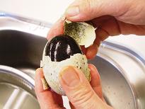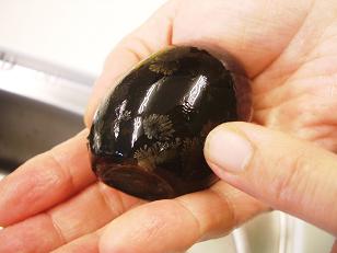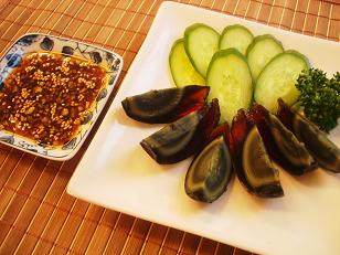 お教室では4月のチャイニーズコースでピータンを使った和え物を紹介します。ピータンをまだ食べた事がない方もいらっしゃると思います。ピータンとは中国のアヒルの卵もしくは鶏卵、うずらの卵を加工した食品です。(先日『鶏卵』とだけ書いていましたが訂正します。伝統的に一番有名なのはアヒルの卵のタイプですが最近では鶏卵タイプのものもけっこう市場に出回っているそうです。)卵の殻の上から石灰や木炭をまぶし溶液が入ったカメに入れて2~3ヶ月冷暗所で保存するとアルカリ成分によって熟成してこんな色合いに変わり、ちょっと個性的な香りがしますがコクのある味わいになり、一度食べると好きになる。そんな食材です。