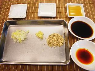 ・しょう油 大さじ2 ・酢 小さじ2 ・ごま油 小さじ1 ・砂糖 小さじ1 ・ラー油 小さじ1 ・きざみねぎ 小さじ1 ・おろししょうが 小さじ1/2 ・すりごま 小さじ1