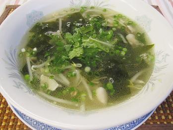 2品目はわかめともやしのスープベトナム風です。炒めた豚肉でしっかりスープをとりナンプラーで味付けをした栄養たっぷりのわかめのスープです。薬味に香菜を入れてフレッシュな香りを楽しんでいただきます。
