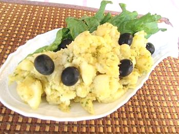 2品目はスペイン風じゃがいものサラダです。地中海沿岸で食べられているにんにくの効いた卵黄のソース・アイオリソースとじゃが芋をミックスしていただくサラダです。相性のよい黒オリーブを添えていただきます。白ワインにもよくあいますよ。