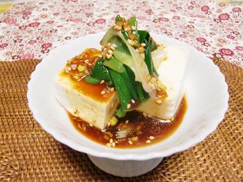 3品目は季節の野菜、葉たまねぎを使った豆腐と葉玉ねぎの赤酢コチジャンたれです。