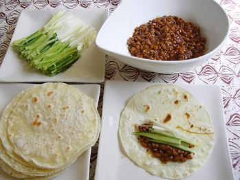 2品目は納豆と挽肉の北京ダック風です。甜麺醤で味付けした納豆入りの豚挽き肉を餃子の皮をアレンジした中華風クレープで包んでいただきます。
