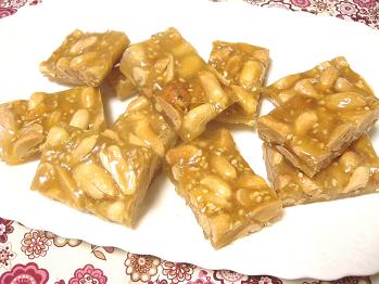 スイーツは胡麻のタフィーです。タフィーとはバターを砂糖で煮詰めた中にピーナッツを入れたキャンディーの一種です。