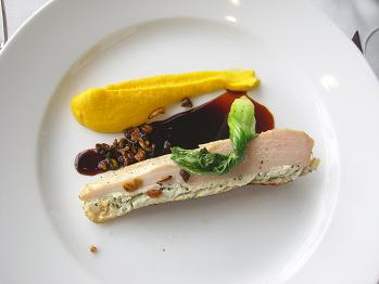こちらもメインです。スチームした鶏肉とクリームチーズにかぼちゃのムースとバルサミコソースが添えてあります。こちらは文句なしの美味しさでした!