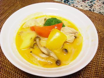 ココナッツミルクを使ったオリエンタルな鶏肉のスープです。赤・黄パプリカを使い色鮮やかに仕上げます。やはりエスニックな風味ですが淡白な味付けはパンにもよくあいます。
