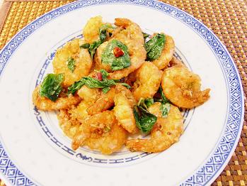 2品目は海老のバジル炒めです。フレッシュバジルの葉を入れたちょっとエスニックな海老の炒め物です。