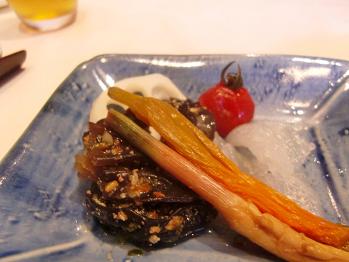 こちらはふしうりというゴーヤのようなお野菜と鴨の水たきです。骨ごとボイルされた鴨肉はこだわりの沖縄の塩でいただきました。