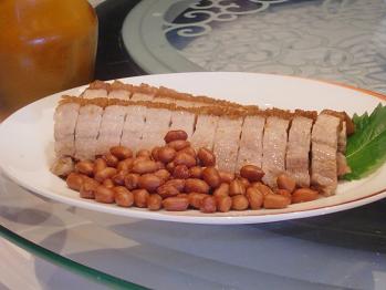 そしてこちらも名物、豚の甘辛味のチャーシューです。五目豆のように甘い大豆が添えてられているのが特徴です。