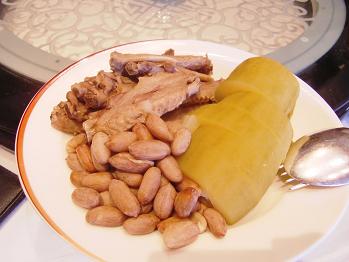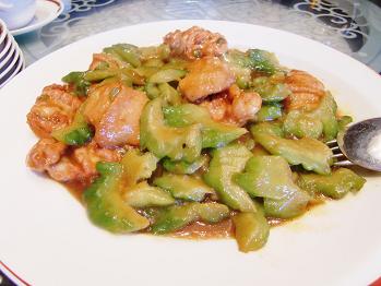 苦味が少ない中国ゴーヤを使った鶏肉と海老の煮込み、