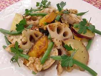 3品目は根菜3種のサラダです。かぼちゃ、さつま芋、蓮根と洋風にいただくチャンスがなかなかないお野菜を今回はサラダとしていただきます。