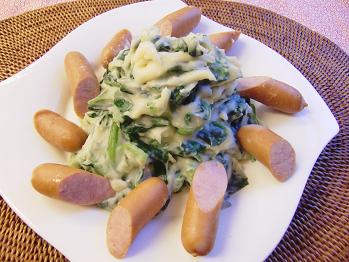 こちらはお子さんに喜ばれそうなお料理ですね。今回はソーセージを横に添えましたが例えば唐揚げにしてみても良いと思いますよ。実は今年クロアチア旅行をした際に向こうでこのお料理をよくいただきました。マッシュポテトの単調な味がほうれん草でアクセントがついて食欲をそそる一品です。