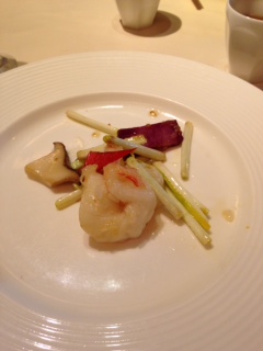 3品目は豆腐のねぎ風味です。 豆腐に種々の野菜、ピータン、干蝦をのせて豆板醤を使った葱風味の