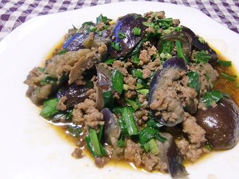 2品目はなすのひき肉炒めです。夏野菜のなすをニラを使ってひき肉と炒めた食欲をそそり、活力を与えてくれるお料理です。
