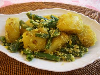 3品目はじゃがいもといんげんのココナツ風味です。じゃがいもは便利な食材なのですが揚げ物や煮物など、レシピのバリエーションとしては正直ありきたりのものばかり。でも今回はちょっとエスニックにクミンをきかせて、ココナツ風味にいただくインド式のレシピを紹介します。