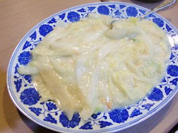 白菜のクリーム煮です。ポイントは干し貝柱で旨味を引き出して寒い時期甘い白菜をコクのある甘味に仕上げるところです。
