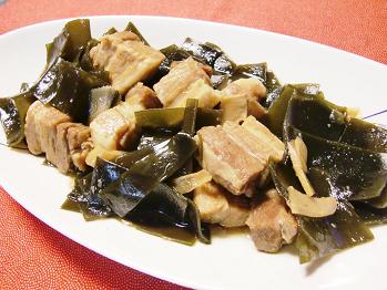 2品目は豚ばらと昆布の煮物です。意外な組み合わせに思われがちな豚肉と昆布ですが、沖縄ではよく使われる組み合わせです。