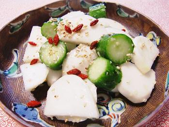 かぶときゅうりの和え物です。さっぱりと塩味で最後にぱらっと胡麻をふってクコの実を散らして出来上がり。