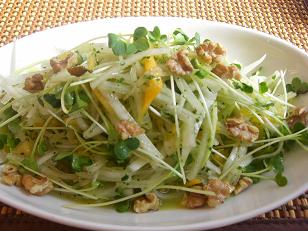 続いて大根サラダです。和食材、それも冬にもっとも美味しくなる大根を使ったサラダです。胡桃(くるみ)も加えて洋風に仕上げていますが、洋風のドレッシングがマッチするおしゃれなサラダです。