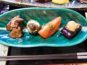 先付 鶏肝生姜焼き、蛇腹胡瓜の蕗味噌、トマトバジルソース、揚げ茄子の胡麻味噌です。