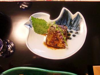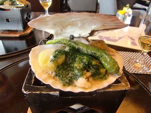 帆立貝の上に京野菜のしし唐辛子と四万十川の青のりをのせて焼いたものです。正に絶品といえる味でした。