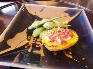 ご存知の方もいらっしゃるかもしれませんがインカの目覚めというじゃがいもを蒸した上にかつおの塩辛がのったものです。サイドにあるのは丹波の黒豆の枝豆という斬新な一皿です。