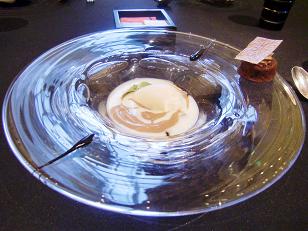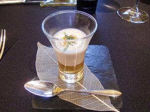 下はリンゴ果汁で上にシナモンという季節感溢れる斬新な一品です。これがとっても美味しかったですね。