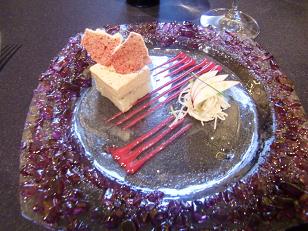 まずは前菜からです。根セロリのフォンダンとガトー仕立てにビーツのクーリとメレンゲを添えてです。味もさることながらお皿の美しさを堪能しながら目でも楽しめる一皿です。
