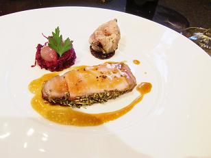 肉料理は岩手産ハーブ豚8種類の乾燥スパイスの香りをまとわせグリエ佐渡ヶ島産イチジクのベニエを添えてです。ジューシーな肉汁とハーブの相性、いちじくの甘味の組み合わせが印象に残っています。