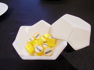 MERCI(ありがとう)と書かれた思わず微笑んでしまう飴です。格式もある一方で人をふとなごませるところがロブションの技なのかも知れません。