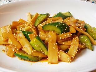 2品目はメンマときゅうりのピリ辛炒めです。メンマは炒めても美味しいお惣菜になる便利な食材です。ご飯との相性もぴったりですから覚えておけば季節を問わずにいただける一品です。