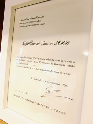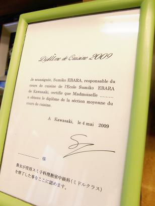 教室ではレッスンを一定の時間レッスンを受講された方に修了証書を差し上げています。緑の額の証書はミドルクラス(中級科)を修了された方のためのものです。