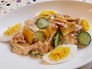 3品目はかぼちゃときゅうりのコチジャンマヨです。季節のお野菜を使ったサラダです。夏の野菜には体温を低下させる働きがありますから積極的にお料理に取り入れて下さい。