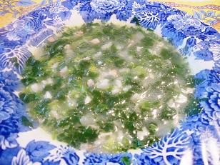 ほうれん草と米のスープです。これはイタリア料理のレシピです。お米をスープに入れる意外性にとまどわれる方もいるでしょうが、イタリアではお米を野菜としていただくので決して風変わりなレシピというわけではないのです。