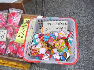 87歳のおばあさん手作りのお手玉が売っていました。横にある鯛せんべいも漁師町ならではです。