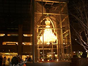 暗くなったガーデンプレイスにシャンデリアのディスプレイが輝きます。