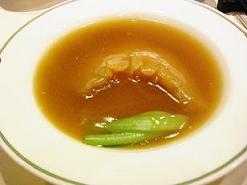 そして「フカヒレの姿煮」です。その美味しさもさることながら気になったのはとろみが片栗粉の食感とはまったく異なる実になめらかなシルクの様な舌触りで細部にまで徹底した料理人の方のテクニックにはただただ脱帽するばかりです。
