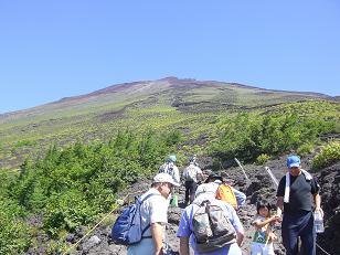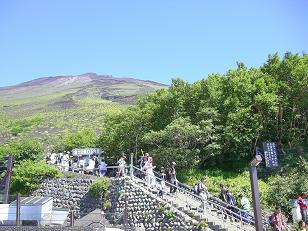 はるか上には山頂があります。一晩山の上で過ごし日の出のご来光を見てから下山する人が多いそうですが、下山してくる体力もあり余る若い人達が憔悴しきっていて富士山はそう簡単に登る山ではないのだと実感しました。何でも標高のせいで高山病になってしまうのだそうですが、一時間ほど五合目にいた私も少しクラクラしはじめ一緒にいた友人も胸が苦しいと言い始めました。2400mだからといってあなどれないものです。お土産物屋さんのトイレでも私の前の人が気分の悪くなり個室にこもってしまって高山病の恐ろしさを思い知りました。
