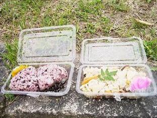 お腹もすいたのでここでご飯。購入したのは石舞台ならではの古代米のおにぎりと筍(たけのこ)ご飯。古代米のおにぎりは美味しかったです。筍ご飯は、五目炊き込みご飯といった感じでした。