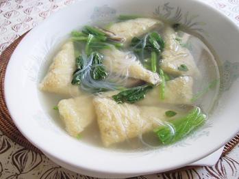 3品目は油豆腐粉絲湯お揚げと春雨のスープです。油揚げの内側に干し海老入りの肉団子を詰めた春雨入りのやさしい味のスープです。まろやかなスープの味わい、油揚げを噛むと口にあふれるジューシーな肉汁の美味しさを堪能して下さい。