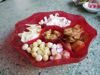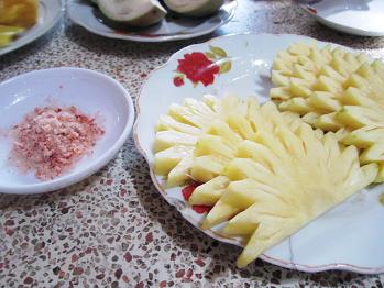 なんと果物に唐辛子入りのお塩を付けていただくのです!日本のすいかもお塩をつけますが唐辛子入りには驚きました。