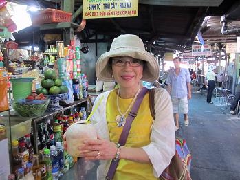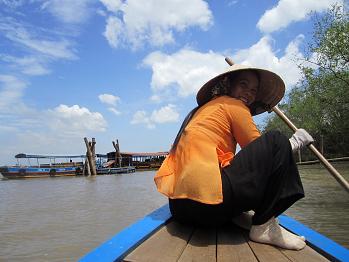 青い空に茶色いメコン川、そして日笠を被る女性といった何ともベトナムらしい風景です。