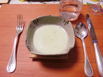 荷物をほどいてから数日後、早速買ってきた食材を使って何品か作ってみました。まずは前菜のじゃがいもとクレソンのポタージュ、