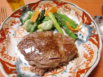 牛フィレ肉のステーキと季節の野菜のソテーにトリュフオイルをたらしてみました。
