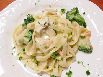 豆乳クリームのフィットチーネです。豆乳クリームを作る際にトリュフクリームを加え、さらに最後の仕上げにトリュフの粒をおろしてふりかけました。正直レストランだったらどれだけの値段がついてしまうんだとう・・・と思わずほほえんでいただきました。