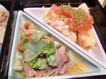 とてもNOBUらしかったのがこの二品です。手前にあるのがセビーチェというサーモンと貝をマリネしてコリアンダー(香菜)を添えたペルー料理です。