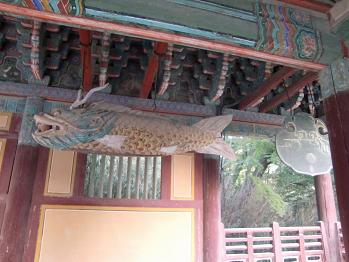 これが本当の木魚でしょうか?髭の生えた龍のような見事な木彫りのお魚が吊り下げられていました。