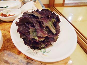 焼肉だけではなくプルコギもこの珍しい黒いサンチュにくるんでいただきます。