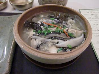 アワビの焼き物です。確かに韓国料理ですが素材の持ち味を生かし薄味で仕上げる料理法は私たちの知る韓国料理とはほど遠い日本の懐石料理の味に限りなく近いのです。