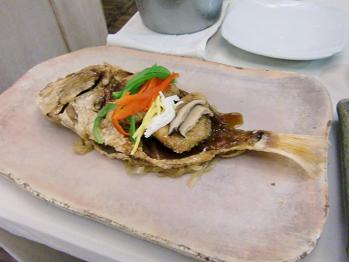 揚げた鯛にお野菜を載せたシンプルなお料理です。味もさることながらお皿がとても素敵でした。