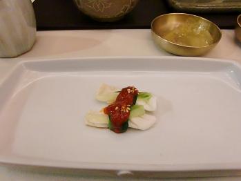 今回、韓国宮廷料理をいただいて面白かったのはどの料理もほんのり甘いという点です。決して甘口に仕上げている訳ではないのに風味のように甘味が利いているのです。韓国の宮廷料理をテーマにしたチャングムというドラマで料理に梨や柿を使っていましたけど、おそらくそうなのでしょう。まるで懐石のような味でしたがやはり要所々ポイントは違うものなのですね。